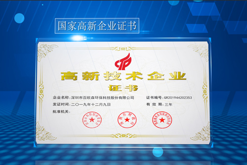 熱烈慶祝,深圳市百歐森環保科技開發有限公司通過國家高新技術企業審核,正式成為國家高新技術企業,從此百歐森在眾多榮譽皇冠上又多了一顆璀璨的明珠。資質相關的具體事項已在相關網站上進行公示,敬請新老客戶前往查詢!