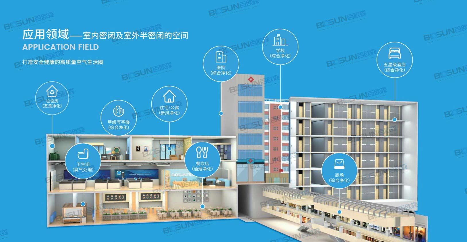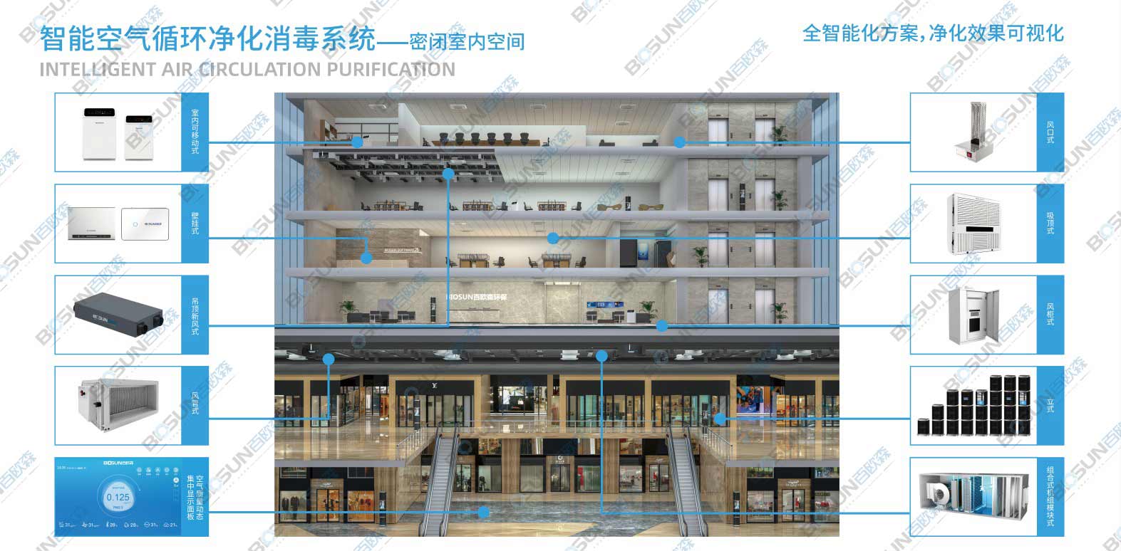 運用從源頭治理到持久調控空氣質量的解決理念,在室內安裝空氣凈化消殺系統是更高效更便捷的主動式空氣質量和病毒消殺方案。百歐森研發出了一系列不同公共場所的室內空氣污染解決方案,與目前單一使用空氣凈化器的方式不同,百歐森可根據每個項目的污染程度、資金預算、人流量,建筑結構等要素定制不同的空氣凈化消殺解決方案,長效凈化空氣,預防細菌病毒交叉感染。還可根據客戶要求定制智能化解決方案——采用智能化控制系統,遠端程序控制、實時調節、空氣質量監測和智能終端互聯在家用、機場、辦公室、學校等公共場所有著廣泛的應用需求。