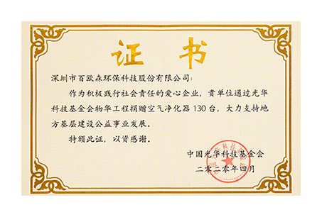 百歐森在向“智慧凈化殺菌頂級服務商"邁進的同時,本著“共同進步,共享豐盛”的理念,在發展各項業務,企業成長的同時不忘感恩員工、股東和社會大眾,公司在履行企業社會責任的道路上從未止步,在教育、環保、文化、扶貧等領域投入了真誠的關注與用心,以實際行動為公益奉獻力量,做一名優秀的企業公民。